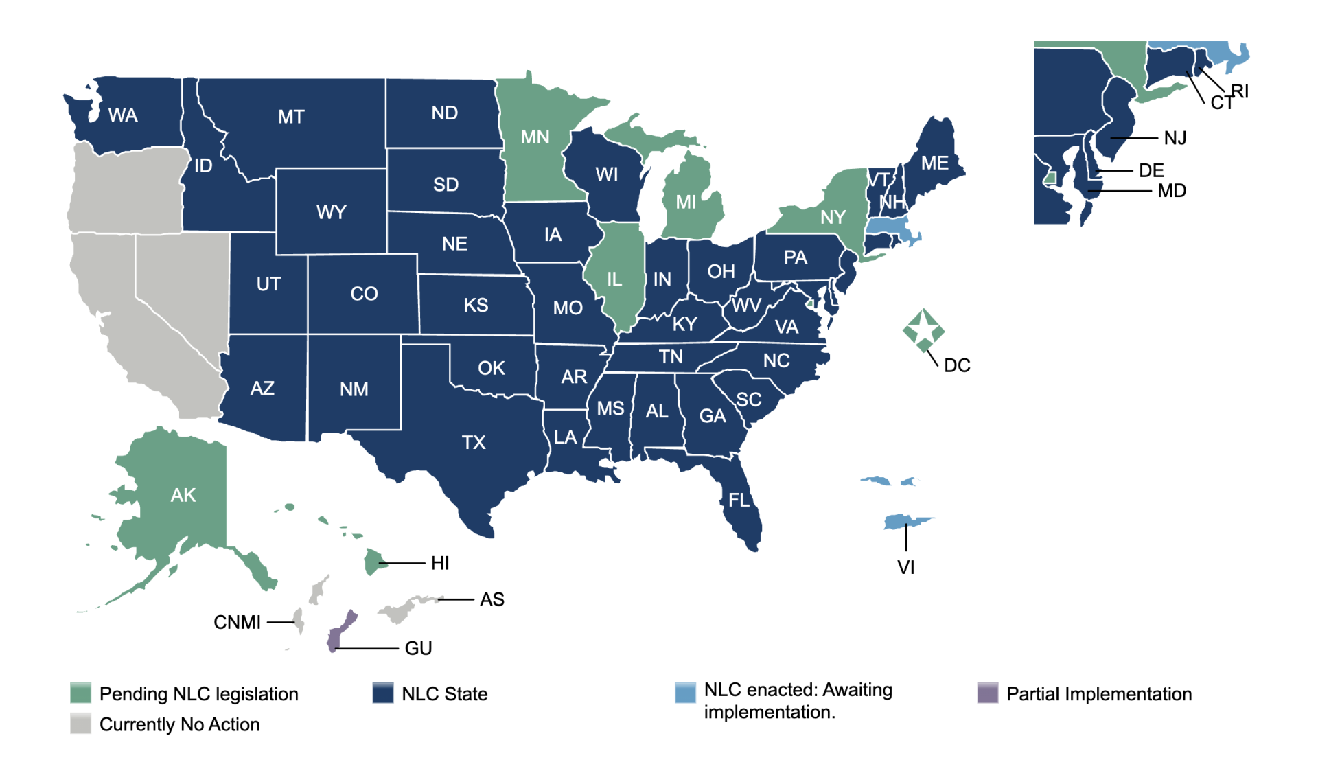 Several states have passed legislation to join the NLC and are in various stages of implementation. Notable new participants include:
